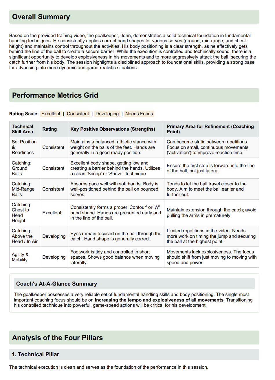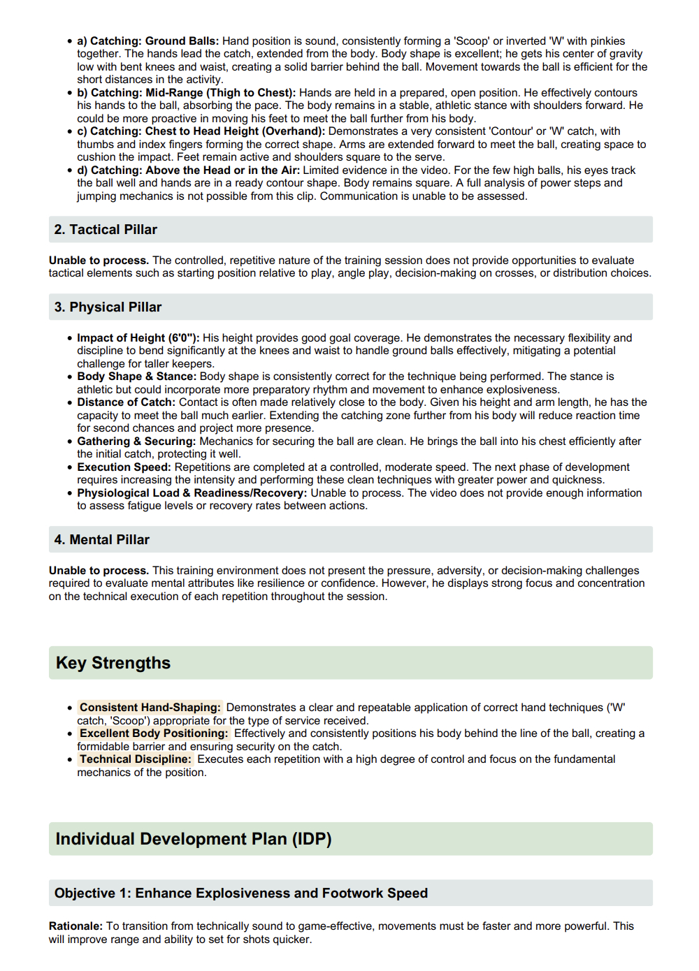 The report identifies your strengths and areas for improvement within each pillar. These strengths, which range from good body positioning to consistent hand shape, are identified so you can improve while focusing on the areas that require the most attention.
